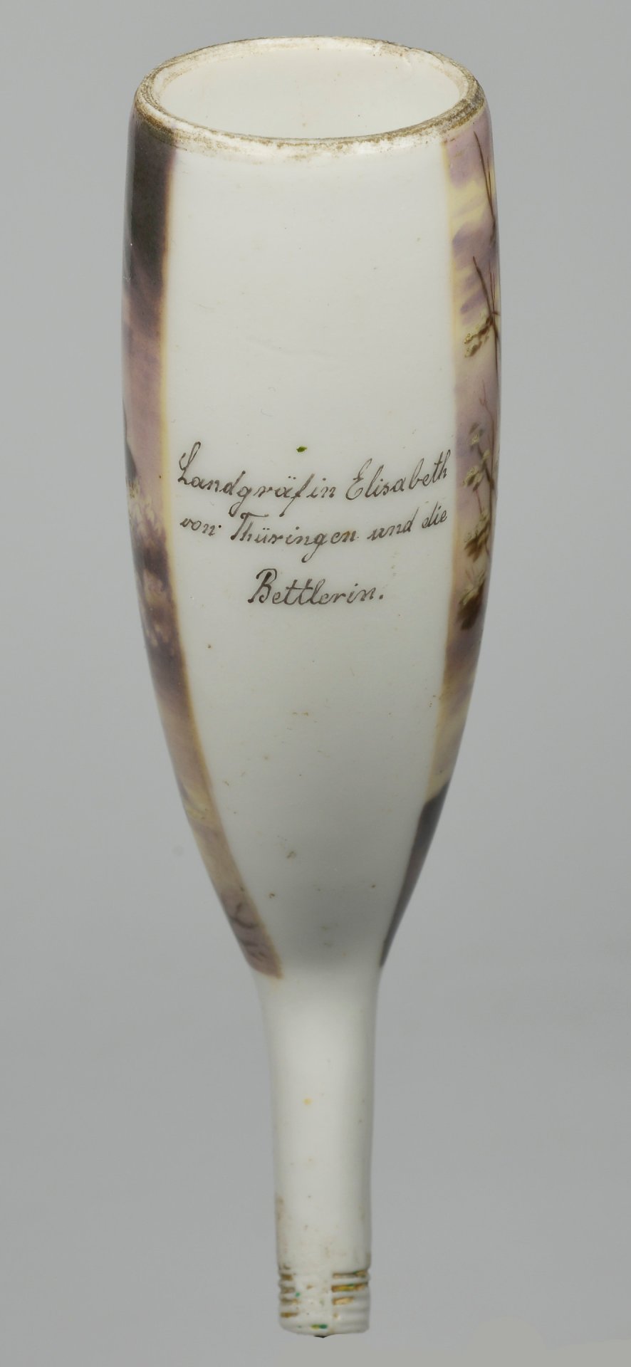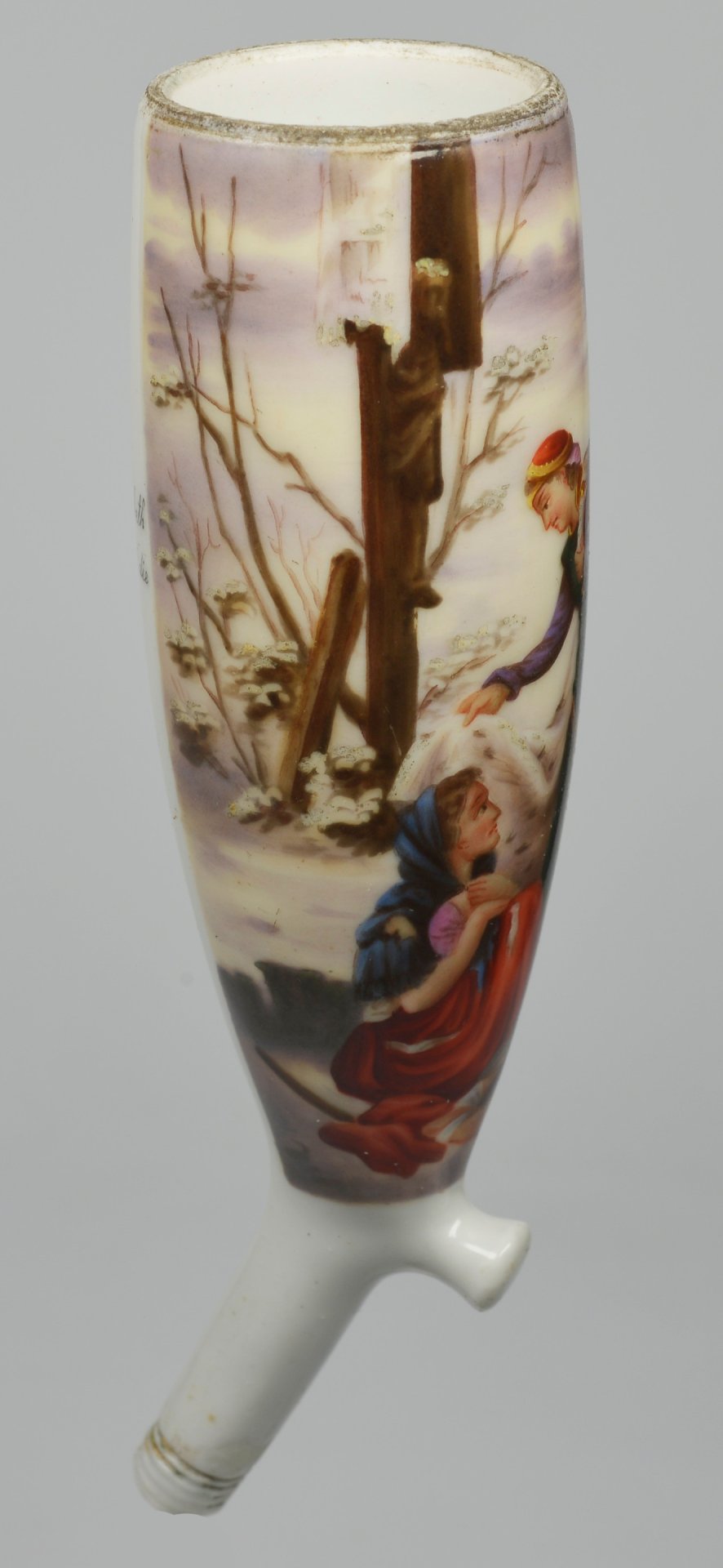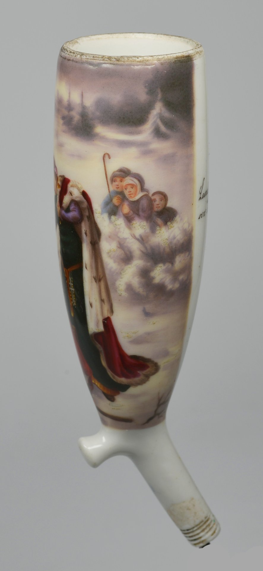 Pfeifenstummel aus Porzellan, mit bunten Muffelfarben den Korpus zu 2/3 umfassend die Darstellung von Elisabeth von Thüringen, wie sie in tiefem Schnee einer Bettlerin einen Fellmantel als Umhang reicht; sie wird von drei Kindern, die abseits im Schnee stehen, beobachtet; auf der Rückseite ist in schwarz handschriftlich vermerkt: „Landgräfin Elisabeth von Thüringen und die Bettlerin“; H=12,8cm (b=101; c=36,5mm)