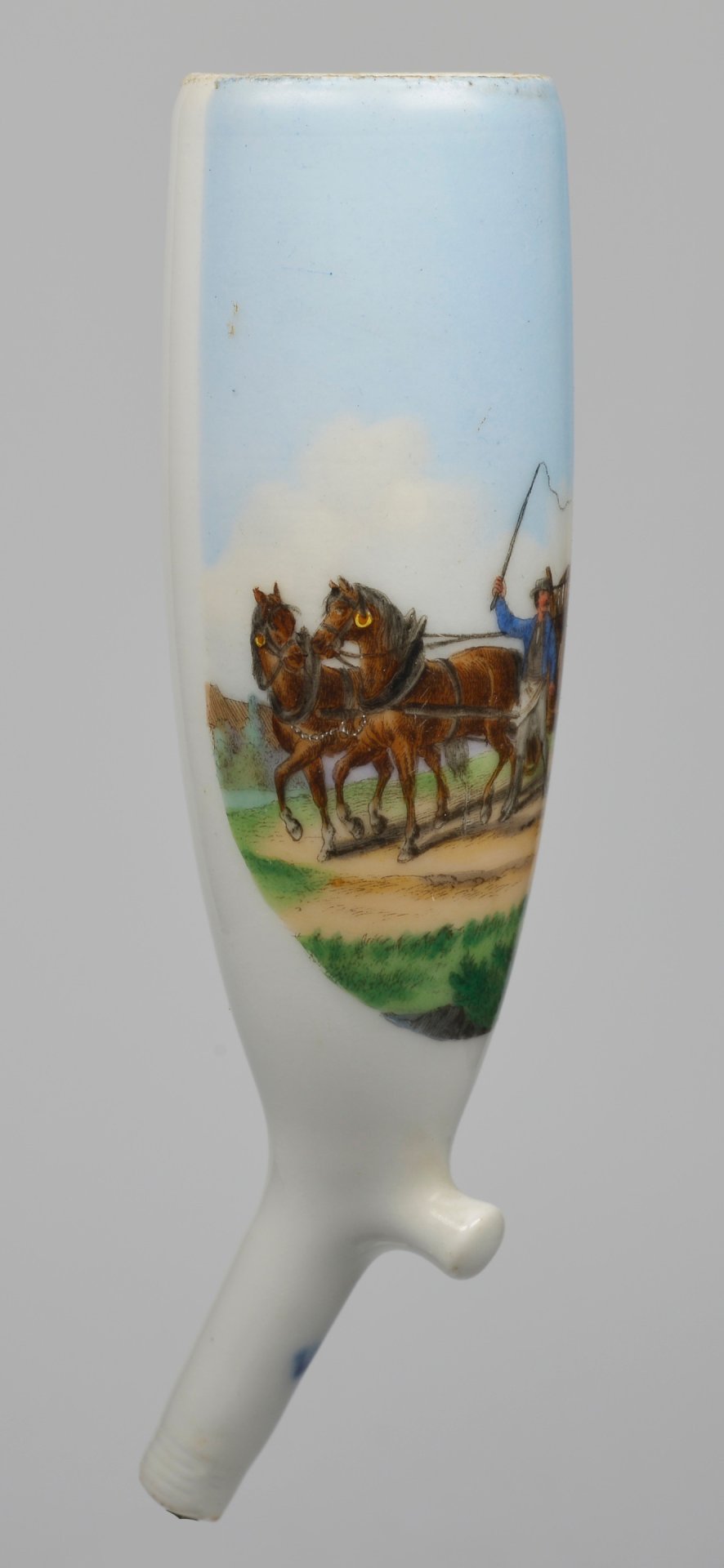 Pfeifenstummel mit Abbildung eines Pferdefuhrwerkes, das leere Holzfässer transportiert, nicht definierte Blaumarke auf dem Stiel. H=13,1cm (b=104,2; c=36,4mm)