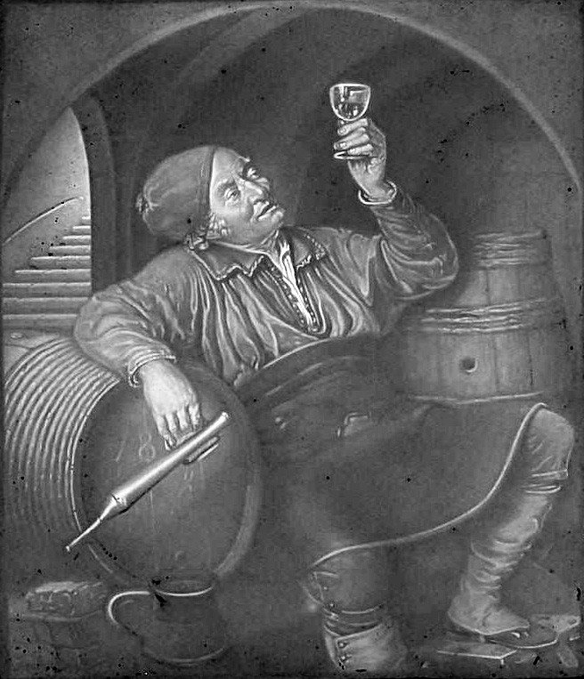 KPM Berlin, Lithophanie, bezeichnet „Der Weinprober, nach Pistorius“ (vergl. /64, Appendix C, KPM Preis-Courant), Vorlage ist das Gemälde von Eduard Karl Gustav Pistorius (1796-1862) „Der Trinker am Fasse“ (vergl. /177, Bd2, Seite 280/), 7,5 x 6,5 Zoll (19 x 16,5 cm)