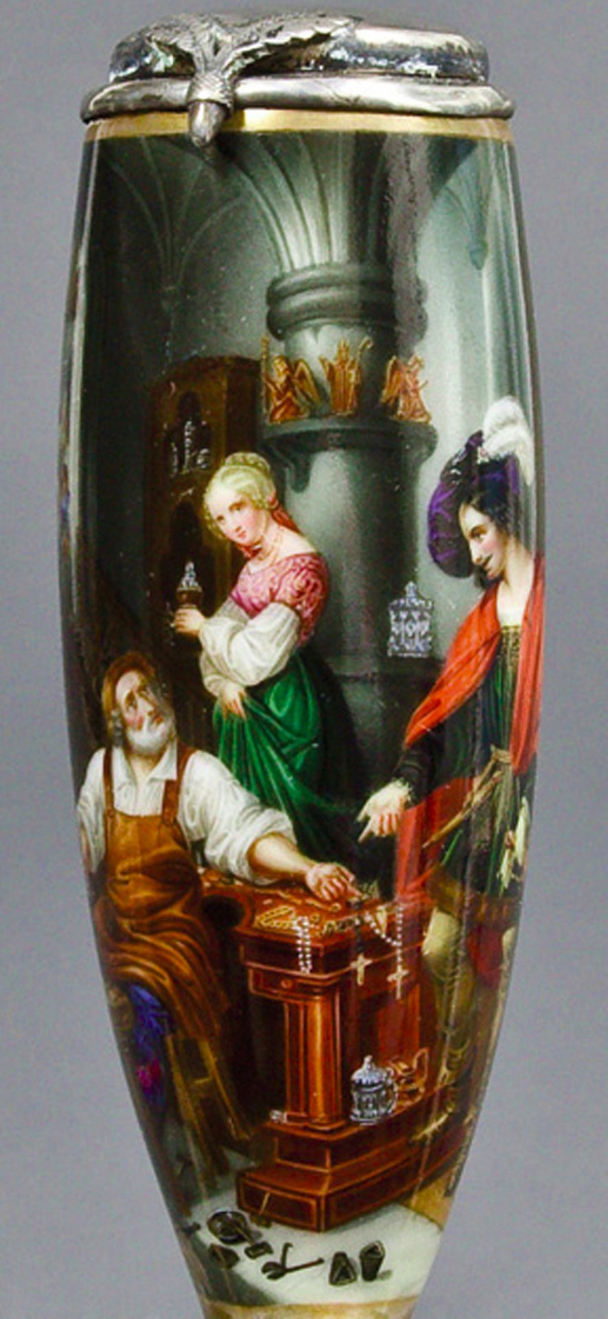 Pfeifenstummel aus Porzellan; „Berliner Form; in bunten Muffelfarben Illustration zur Ballade "Des Goldschmieds Töchterlein" von Ludwig Uhland (1787 - 1862) nach einem Gemälde von Wilhelm Nerenz (1804 - 1871) aus dem Jahre 1834 (Rheinisches Landesmuseum, Bonn). Im Kessel senkrechter blauer Strich; Montierung: Silber. H.: 15,0 cm