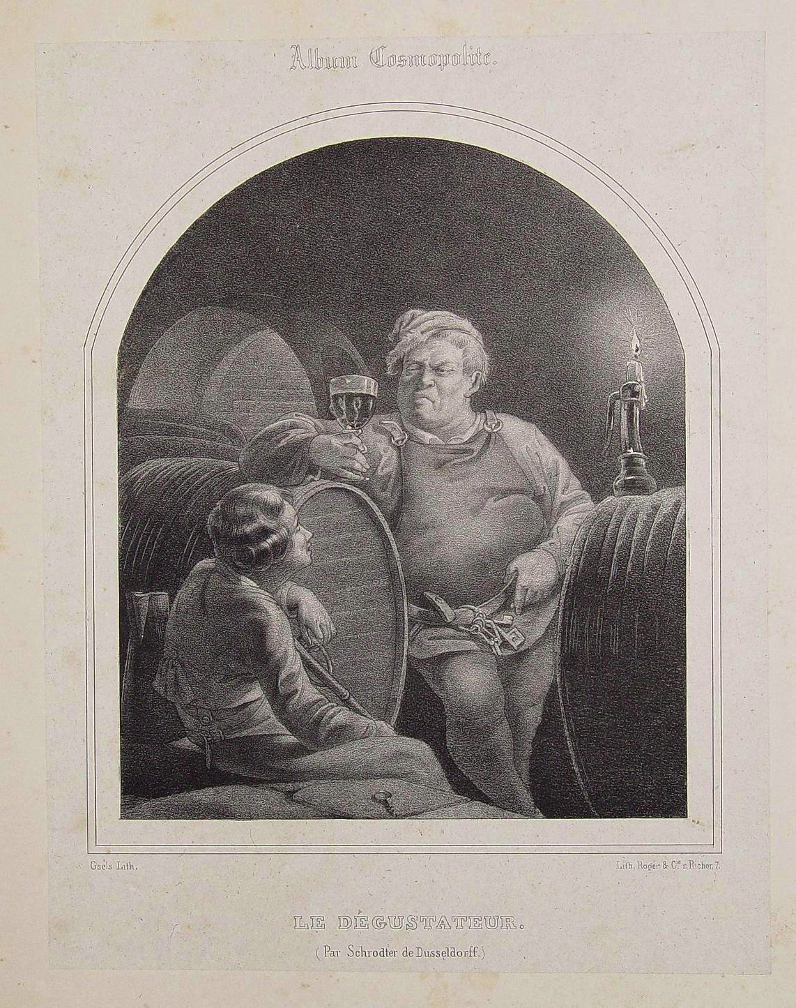 Lithographie um 1840 von Gsels, bezeichnet: "Le Dégustateur" nach dem Gemälde „Rheinweinprobe“ von Adolf Schroedter (1805-1875), Nationalgalerie Berlin (ehemals Schenkung Konsul Wagener), aus Album Cosmopolite; Paris um 1840. Blatt: 37 x 27 cm; Abbildung: 22,5 x16,5 cm