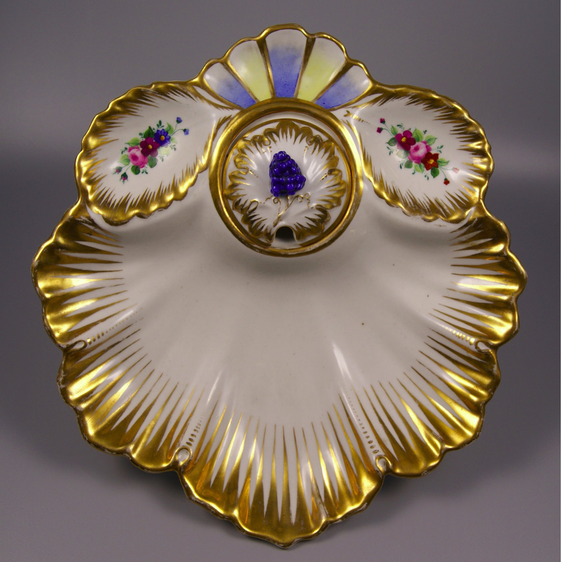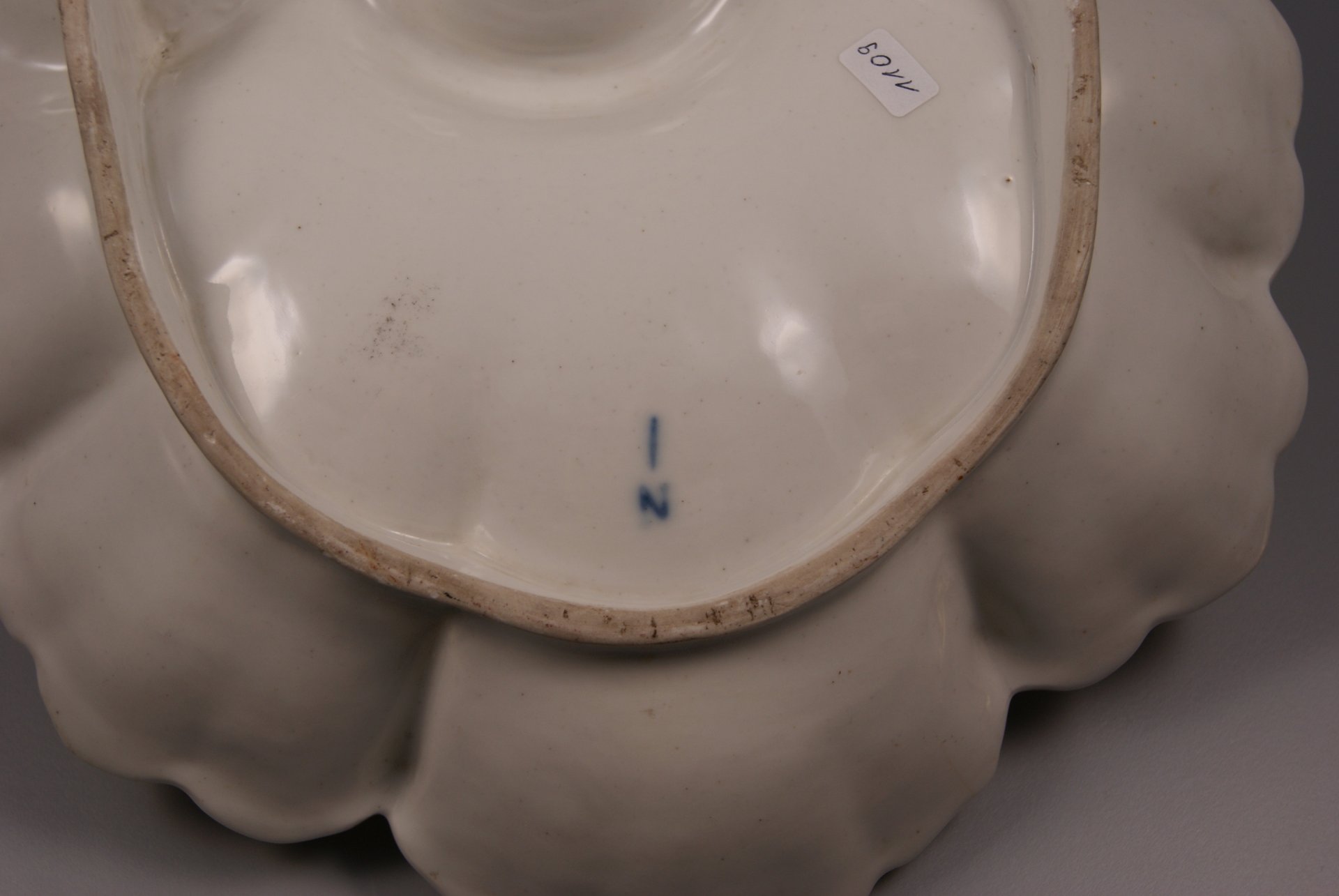 Compotiere, einschalig; Blattform; im Preisverzeichnis über Porcellan-Geschirr, Compotieren, A. Einschalige, p Blattform mit Mostrich-, Pfeffer- und Salz-Behälter, Deckel mit blauer Weintraube als Handhabe, unterglasurblaue Marke „N unter Strich“; H.: 7,0cm; B.: 25,0cm; T.: 26,5cm