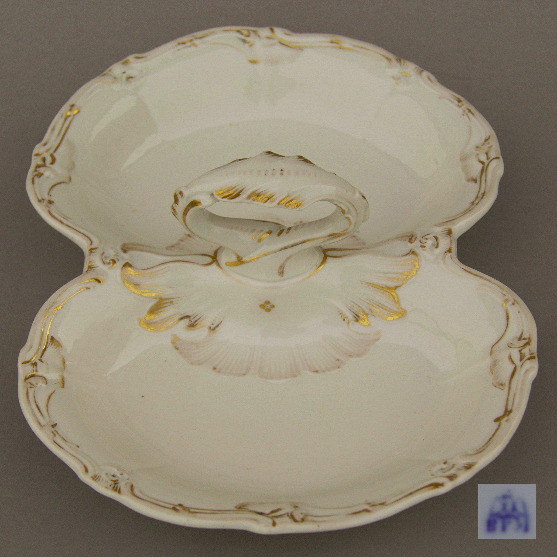 Doppelschale aus zwei nierenförmigen Hälften mit Mittelgriff; Fünffachrippung am Schalenrand; großes vom Mittelsteg in die Schalenhälften ragendes muschelartiges Blatt, darauf Griff aus zwei aufsteigenden leicht in sich gedrehten Blattstielen; am Rand Ornamentstab, bestehend aus liegenden S-Schwüngen, die im Wechsel durch eine große Rocaille und eine kleine Wellenform verbunden sind. Reliefdekor und Henkel goldstaffiert.