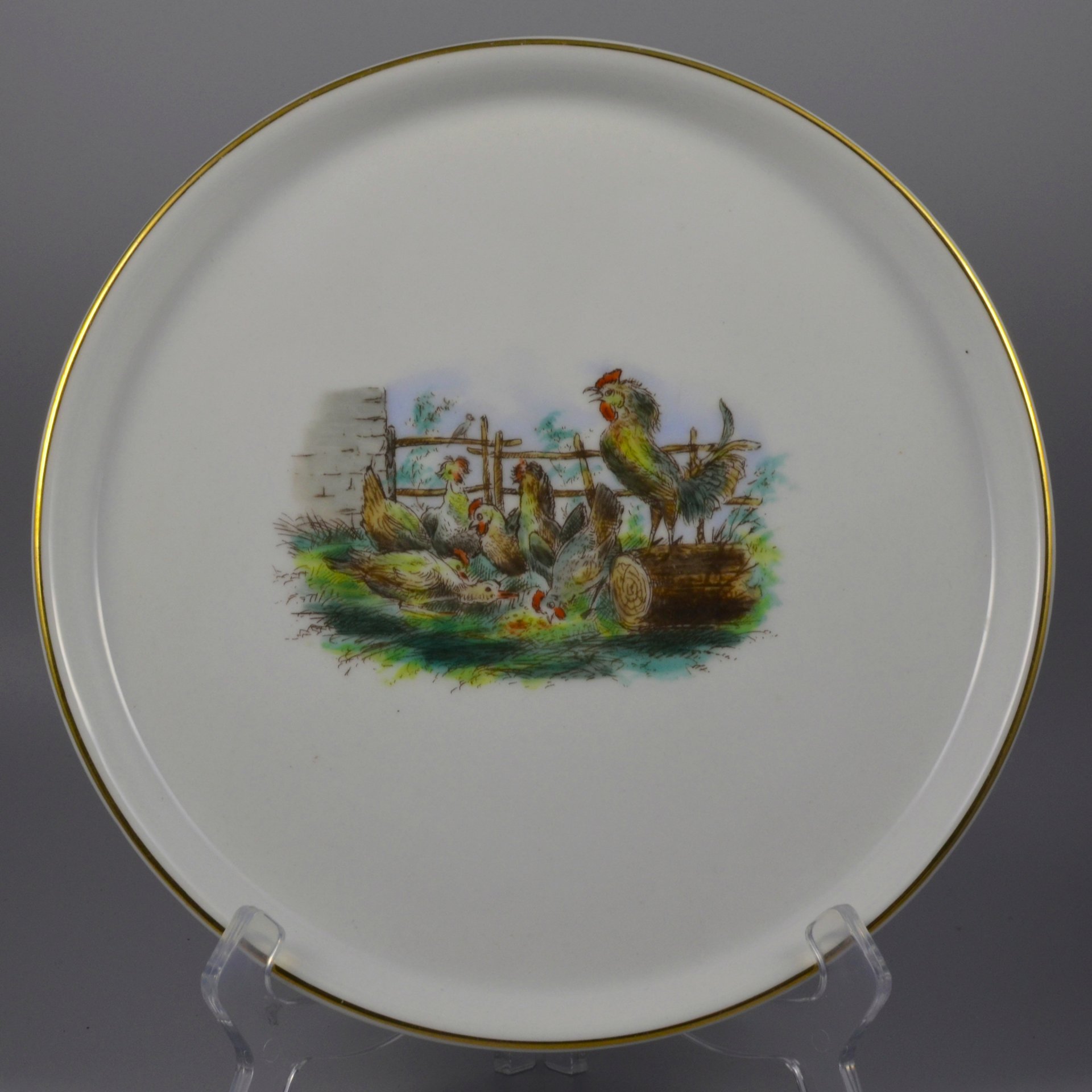 Auf braunfarbigem Umdruck nachträgliche polychrome Bemalung  von Hand. Darstellung von 6 nach Futter pickenden Hühnern und einem auf einem Baumstumpf sitzender Hahn.