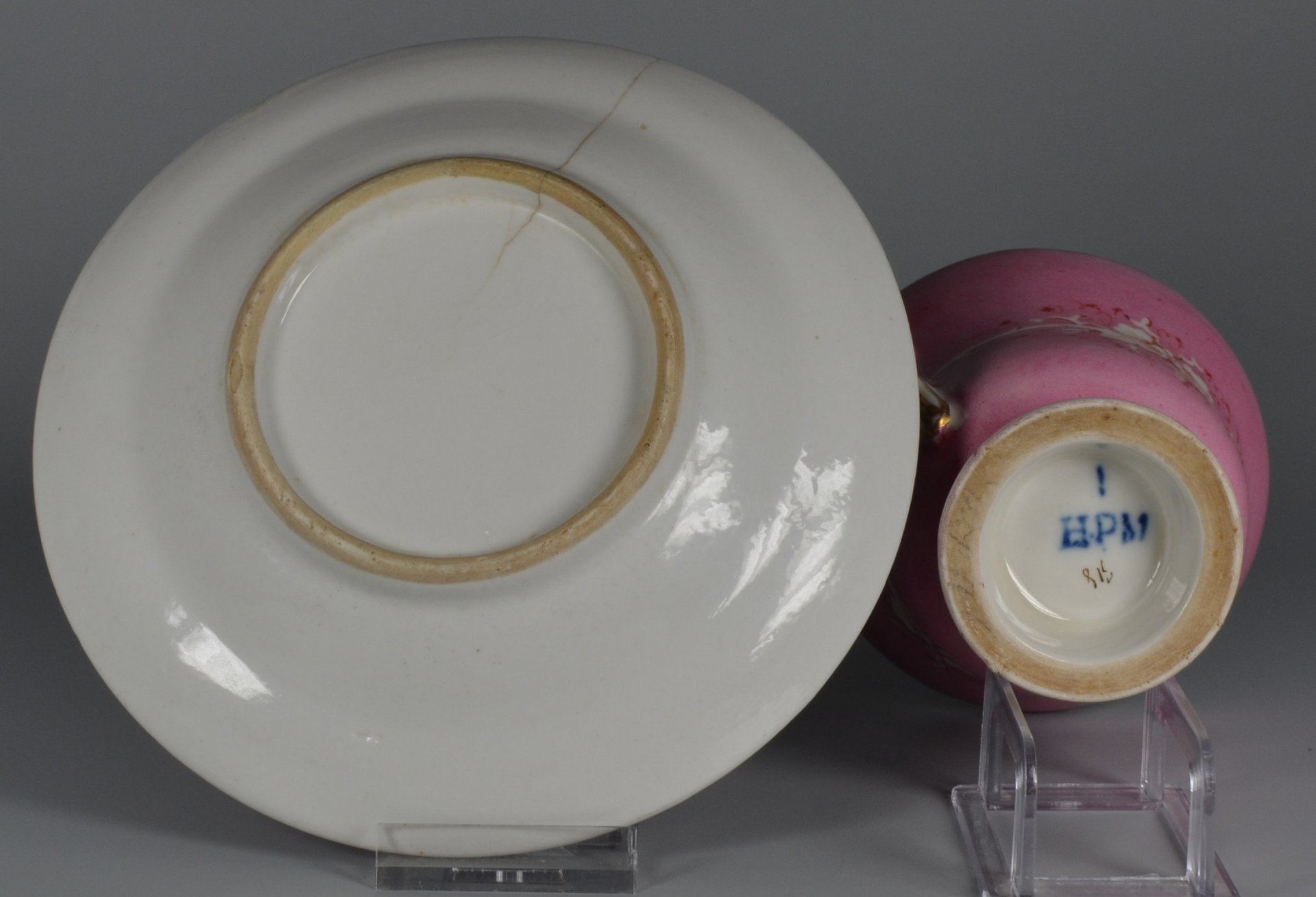 •    Die Porzellanmarke HPM wird auch von der Porzellanfabrik Carl Heyroth & Co. Magdeburg-Sudenburg (1844-1853) verwendet. Vorbild für die Porzellanmarke in den privaten Porzellanmanufakturen in Preußen war die Marke der KPM Berlin, Szepter über KPM (1837-1844). Weil die KPM Berlin ihre Marke 1844 änderte wird die frühere Zuschreibung zu Hasack vermutet.