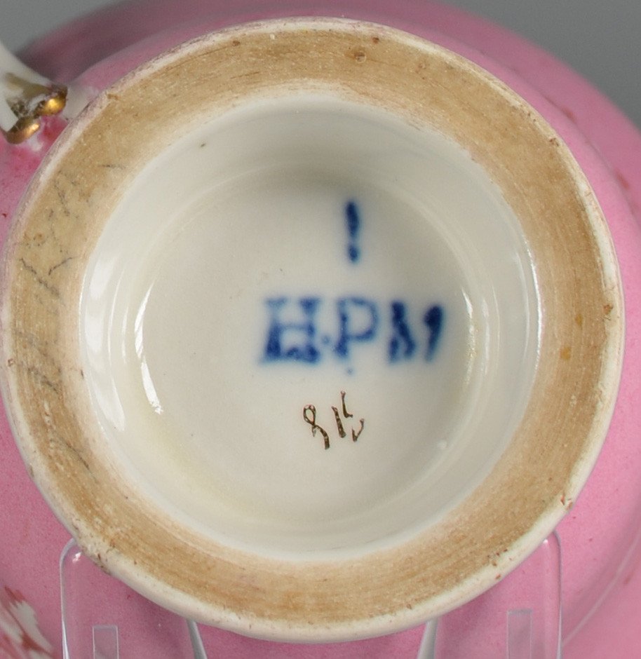Tasse: Glockenbecherform, auf schräg aufgestelltem Stand, Ohrenhenkel oben mit angedeutetem anliegenden Schlangenkopf, Lippenrand innen vergoldet, rosa Fond mit an den Seiten ausradierten paarig angeordneten Blättern und umlaufender Ranke; unterglasurblauer Strich über HPM, in Gold auf Glasur 815; H.:7,8 cm; D.: 8,7 cm