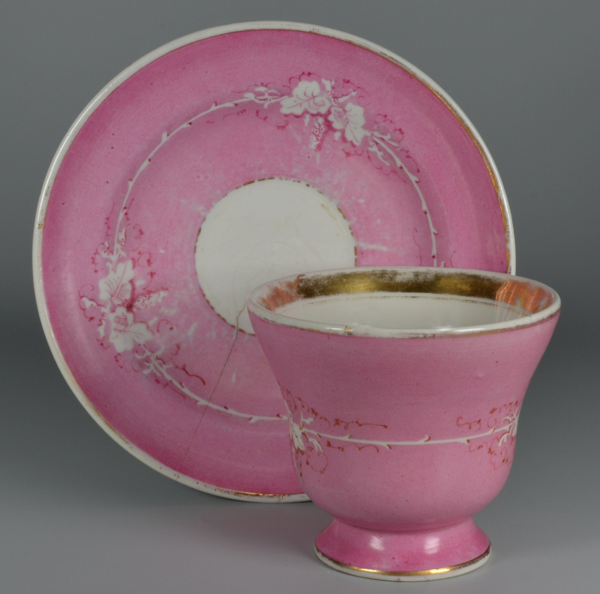 Untertasse: Abgesetzte Fahne, Spiegel weiß, Fahne in Rosa mit drei ausradierten Blätterpaaren, durch eine Ranke verbunden, Dekor passend zur Tasse, ungemarkt, H.: 3,9 cm; D.: 14,8 cm