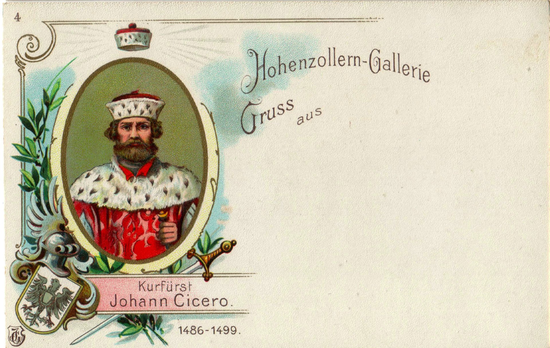 Ansichtskarte Nr. 3 um 1890, Portrait Kurfürst Albrecht Achilles., aus der Serie „Unser Hohenzollernhaus, 20 Portraits“ im Schuber, Verlag von Julius Goldiner, Berlin; postalisch nicht gelaufen.