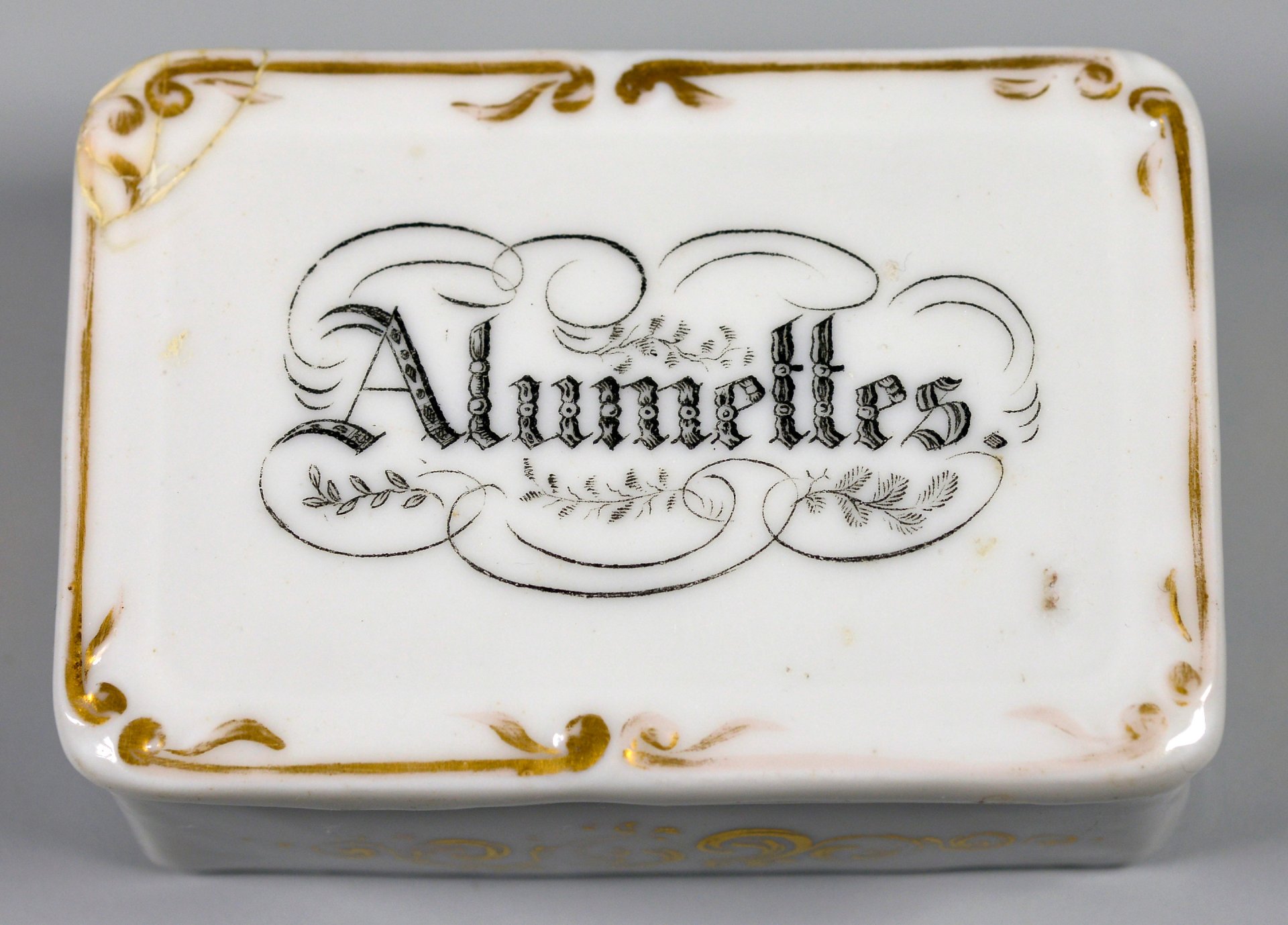 Zweiteilige Porzellandose, Match box, ungemarkt, bestehend aus dem Deckel: Schauseite an den Ecken und am Rand der Längsseiten mit plastischen Rocaillen; auf der gewölbten Oberfläche in schwarzer Schrift „Alumettes“; Unterseite mit Reibefläche;  H x B x T = 11,0 x 7p,1 x 54,0 mm